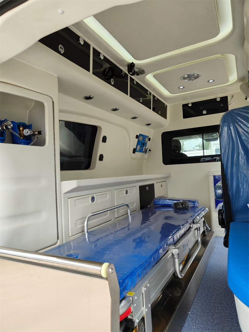 医疗舱内饰采用一次成型内,具有质轻、易清洗等特点,橱柜系统采用ABS吸塑一次成型过渡圆角,避免磕碰受伤。配有220V正玄波逆变电源(自动充电控制)和12V供电系统。放置隐藏式输液瓶悬吊装置,车载隐藏式吸弓|器等。配有前后对讲系统,电动换气系统。