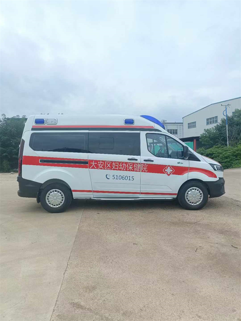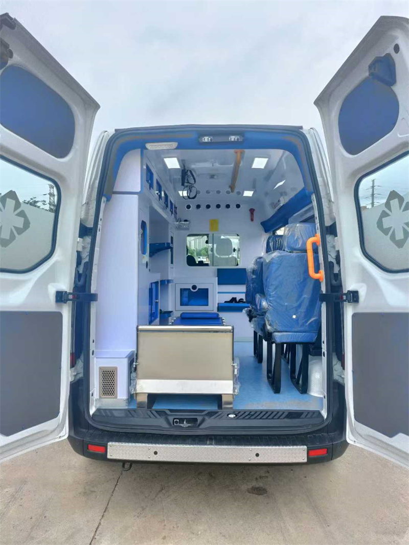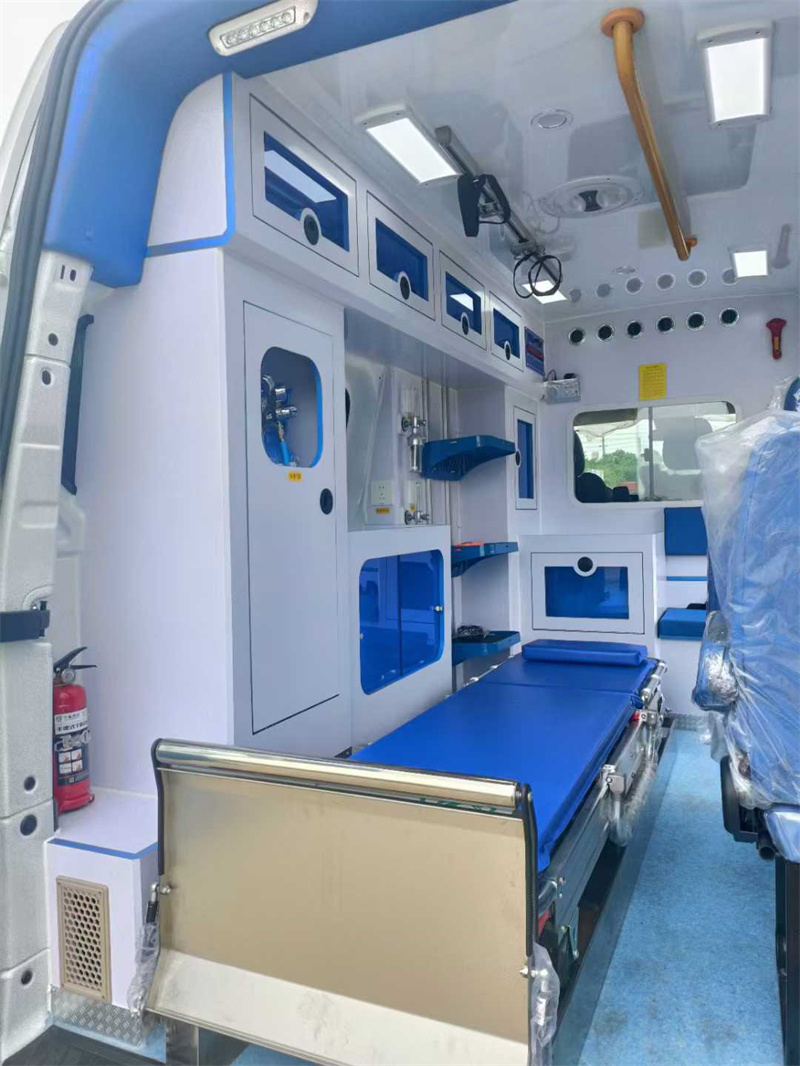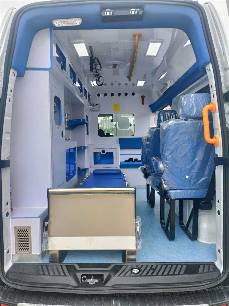 警报、照明系统:100W 警报器,车顶前部嵌入式警灯,车顶尾部安装一体化斜面爆闪警灯(2 盏),车顶左右后侧各安装 一体化斜面爆闪警灯(4个),医疗舱内部LED照明灯(4盏),医疗舱尾部上方安装 1个外场照明灯(夜晚担架上车使用)。