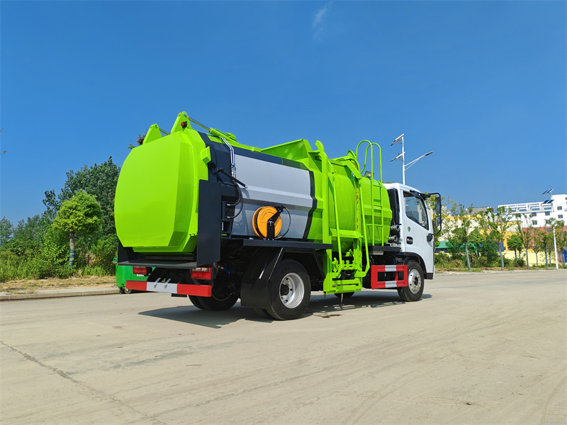 二、容积5立方,厢体采用国标边三底四猛板制作,驾驶室电动操作一键功能,罐体右侧安装挂捅提升机构,推铲卸料带初步固液分离,可挂载120L/240L国标方形垃圾桶,带清洗功能,配清洗管清洗枪,选装200-300升清水箱,后门采用液压开启、液压关闭锁紧、后门安装安全杆,夜间工作照明灯,尾部安装100排污阀,防失误操作。