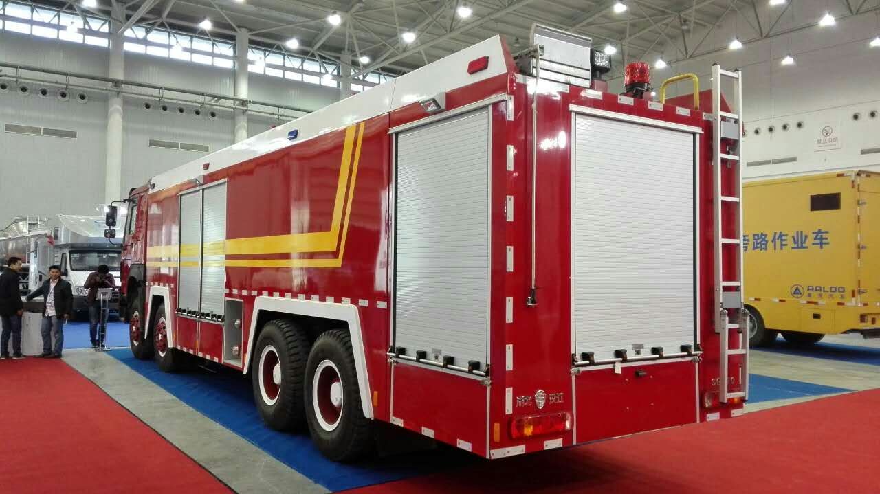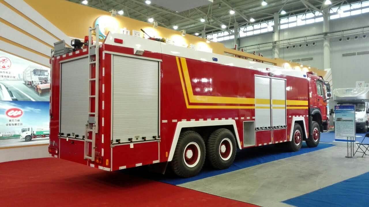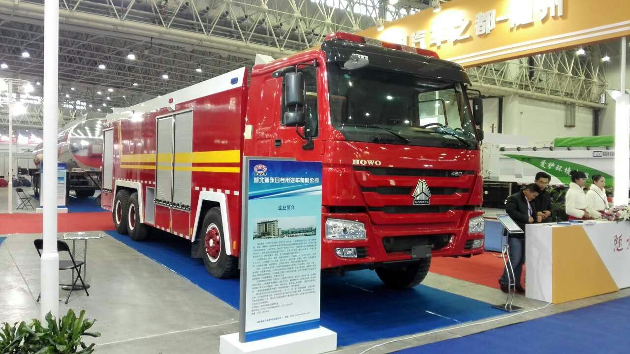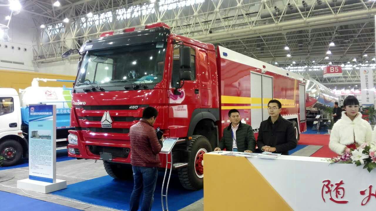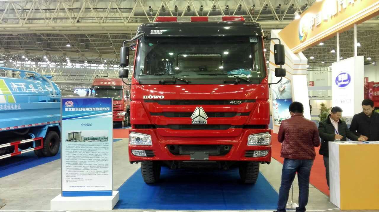 为参加这次展会,我公司送去了一辆豪沃前四后八20吨水罐消防车,该车采用重汽底盘改装,460马力发动机,技术领先,产品具有国家公告,公安部3C认证,产品质量达到国内最好之一。