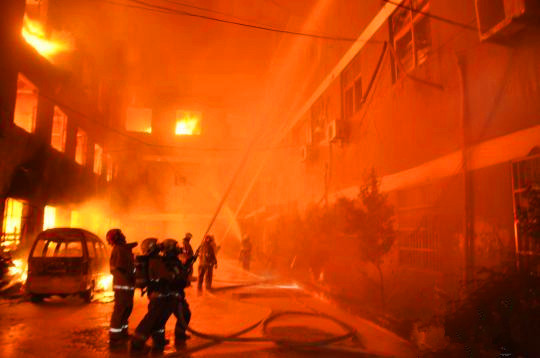 在救援人员的“围追堵截”之下,起火建筑呈现立体燃烧之势,三层的楼板几近坍塌,仅存一副“骨架”孤立在熊熊烈火之中。